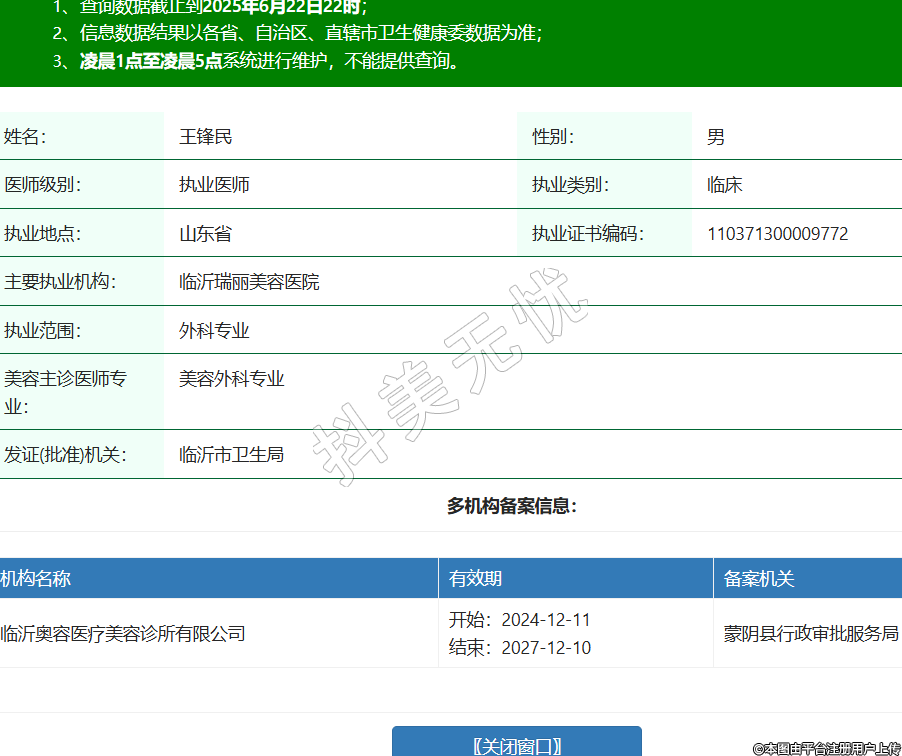 姓名:王鋒民性別:男醫(yī)師級(jí)別:執(zhí)業(yè)醫(yī)師執(zhí)業(yè)類別:臨床執(zhí)業(yè)地點(diǎn):山東省執(zhí)業(yè)證書編碼:110371300009772主要執(zhí)業(yè)機(jī)構(gòu):臨沂瑞麗美容醫(yī)院執(zhí)業(yè)范圍:外科專業(yè)美容主診醫(yī)師專業(yè):美容外科專業(yè)發(fā)證(批準(zhǔn))機(jī)關(guān):臨沂市衛(wèi)生局多機(jī)構(gòu)備案信息:機(jī)構(gòu)名稱 有效期 備案機(jī)關(guān) 臨沂奧容醫(yī)療美容診所有限公司 開始:2024-12-11結(jié)束:2027-12-10蒙陰縣行政審批服務(wù)局 -