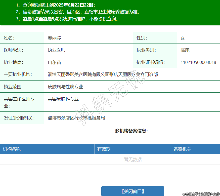 姓名:秦麗媛性別:女醫(yī)師級別:執(zhí)業(yè)醫(yī)師執(zhí)業(yè)類別:臨床執(zhí)業(yè)地點:山東省執(zhí)業(yè)證書編碼:110210500003018主要執(zhí)業(yè)機構(gòu):淄博天麗整形美容醫(yī)院有限公司張店天麗醫(yī)療美容門診部執(zhí)業(yè)范圍:皮膚病與性病專業(yè)美容主診醫(yī)師專業(yè):美容皮膚科專業(yè)發(fā)證(批準)機關(guān):淄博市張店區(qū)行政審批服務(wù)局 -