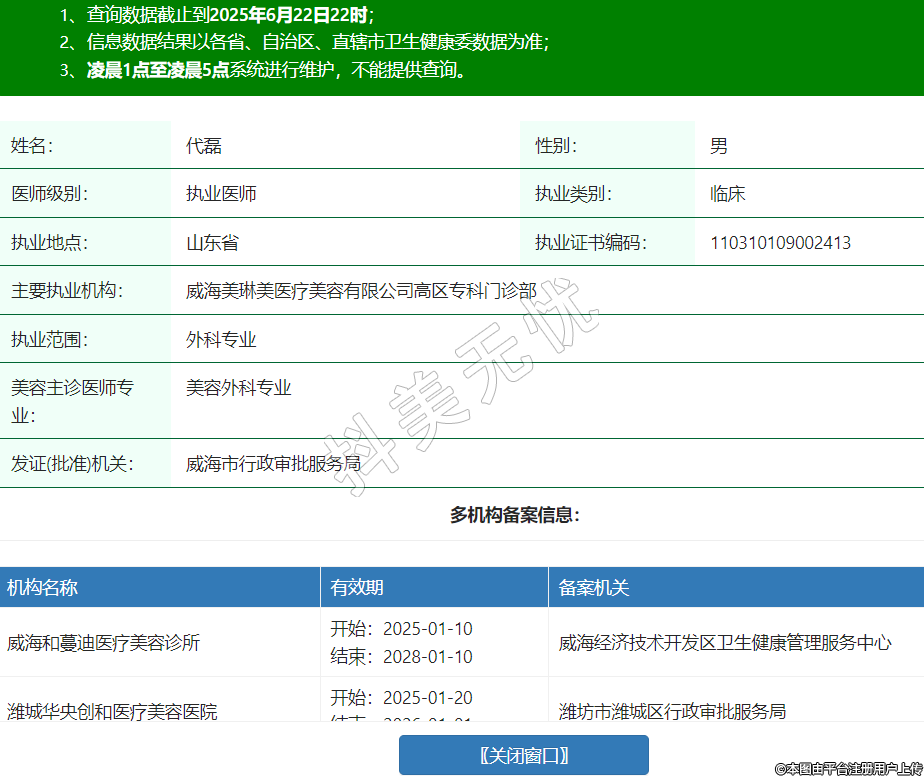姓名:代磊性別:男醫(yī)師級別:執(zhí)業(yè)醫(yī)師執(zhí)業(yè)類別:臨床執(zhí)業(yè)地點:山東省執(zhí)業(yè)證書編碼:110310109002413主要執(zhí)業(yè)機構:威海美琳美醫(yī)療美容有限公司高區(qū)??崎T診部執(zhí)業(yè)范圍:外科專業(yè)美容主診醫(yī)師專業(yè):美容外科專業(yè)發(fā)證(批準)機關:威海市行政審批服務局多機構備案信息:機構名稱 有效期 備案機關 威海和蔓迪醫(yī)療美容診所 開始:2025-01-10結束:2028-01-10威海經濟技術開發(fā)區(qū)衛(wèi)生健康管理服務中心 濰城華央創(chuàng)和醫(yī)療美容醫(yī)院 開始:2025-01-20結束:2026-01-01濰坊市濰城區(qū)行政審批服務局 威海仙美醫(yī)療美容診所 開始:2025-03-15結束:2028-03-15威海火炬高技術產業(yè)開發(fā)區(qū)社會事業(yè)務局 -