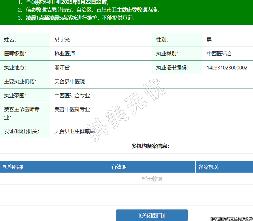 姓名:裘宇光性別:男醫(yī)師級別:執(zhí)業(yè)醫(yī)師執(zhí)業(yè)類別:中西醫(yī)結(jié)合執(zhí)業(yè)地點:浙江省執(zhí)業(yè)證書編碼:142331023000002主要執(zhí)業(yè)機構(gòu):天臺縣中醫(yī)院執(zhí)業(yè)范圍:中西醫(yī)結(jié)合專業(yè)美容主診醫(yī)師專業(yè):美容中醫(yī)科專業(yè)發(fā)證(批準)機關(guān):天臺縣衛(wèi)生健康局 -