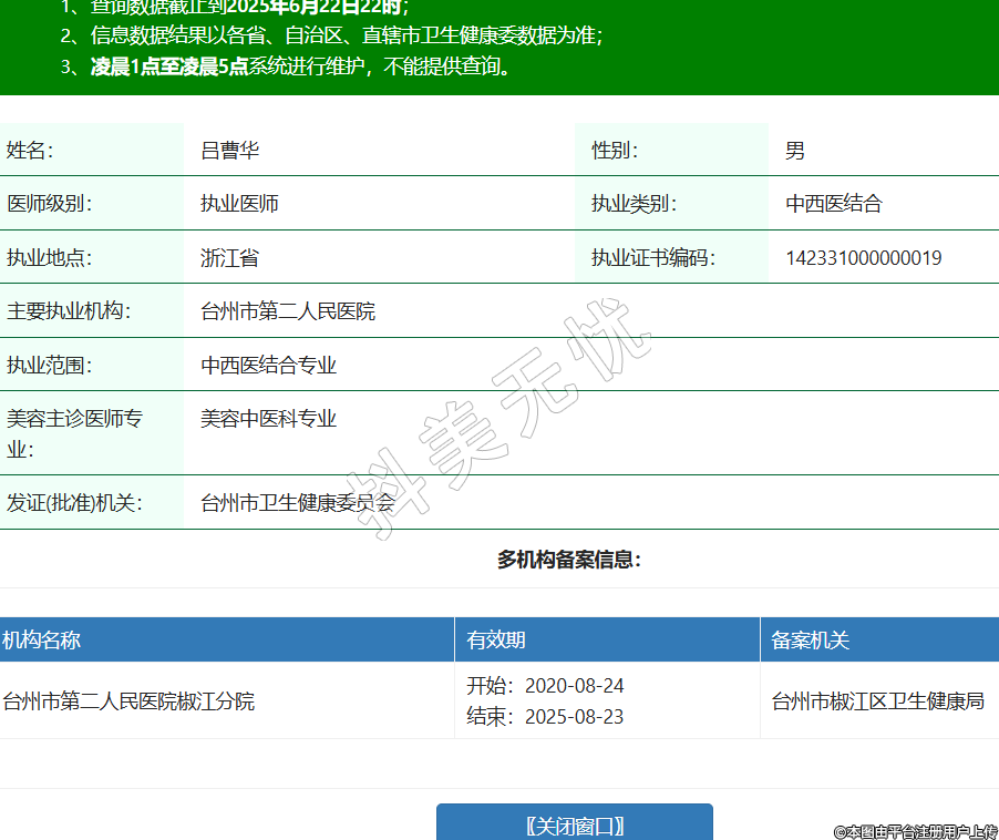 姓名:呂曹華性別:男醫(yī)師級別:執(zhí)業(yè)醫(yī)師執(zhí)業(yè)類別:中西醫(yī)結合執(zhí)業(yè)地點:浙江省執(zhí)業(yè)證書編碼:142331000000019主要執(zhí)業(yè)機構:臺州市第二人民醫(yī)院執(zhí)業(yè)范圍:中西醫(yī)結合專業(yè)美容主診醫(yī)師專業(yè):美容中醫(yī)科專業(yè)發(fā)證(批準)機關:臺州市衛(wèi)生健康委員會多機構備案信息:機構名稱 有效期 備案機關 臺州市第二人民醫(yī)院椒江分院 開始:2020-08-24結束:2025-08-23臺州市椒江區(qū)衛(wèi)生健康局 -