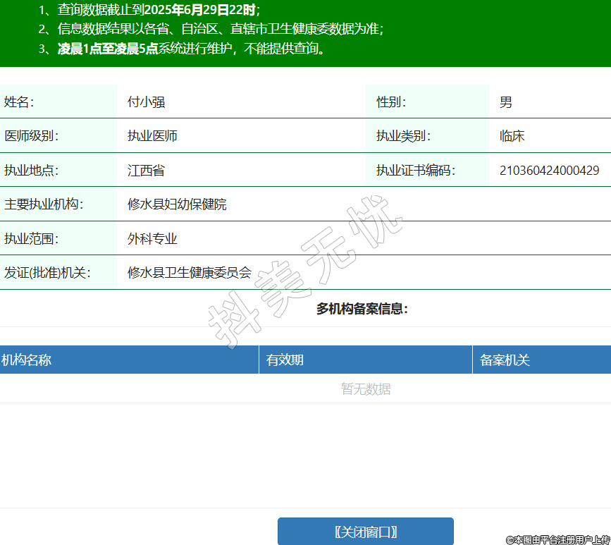 姓名:付小強性別:男醫(yī)師級別:執(zhí)業(yè)醫(yī)師執(zhí)業(yè)類別:臨床執(zhí)業(yè)地點:江西省執(zhí)業(yè)證書編碼:210360424000429主要執(zhí)業(yè)機構:修水縣婦幼保健院執(zhí)業(yè)范圍:外科專業(yè)發(fā)證(批準)機關:修水縣衛(wèi)生健康委員會 -