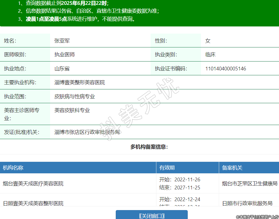 姓名:張亞軍性別:女醫(yī)師級(jí)別:執(zhí)業(yè)醫(yī)師執(zhí)業(yè)類別:臨床執(zhí)業(yè)地點(diǎn):山東省執(zhí)業(yè)證書編碼:110140400005146主要執(zhí)業(yè)機(jī)構(gòu):淄博壹美整形美容醫(yī)院執(zhí)業(yè)范圍:皮膚病與性病專業(yè)美容主診醫(yī)師專業(yè):美容皮膚科專業(yè)發(fā)證(批準(zhǔn))機(jī)關(guān):淄博市張店區(qū)行政審批服務(wù)局多機(jī)構(gòu)備案信息:機(jī)構(gòu)名稱 有效期 備案機(jī)關(guān) 煙臺(tái)壹美天成醫(yī)療美容醫(yī)院 開始:2022-11-26結(jié)束:2027-11-25煙臺(tái)市芝罘區(qū)衛(wèi)生健康局 日照壹美天成美容整形醫(yī)院 開始:2022-12-24結(jié)束:2026-12-31日照市行政審批服務(wù)局 濟(jì)寧新壹美醫(yī)療美容醫(yī)院有限公司醫(yī)療美容門診部 開始:2025-03-21結(jié)束:2027-03-20任城區(qū)衛(wèi)生局 濟(jì)寧新壹美醫(yī)療美容醫(yī)院有限公司醫(yī)療美容醫(yī)院 開始:2025-05-13結(jié)束:2028-05-12任城區(qū)衛(wèi)生局 -