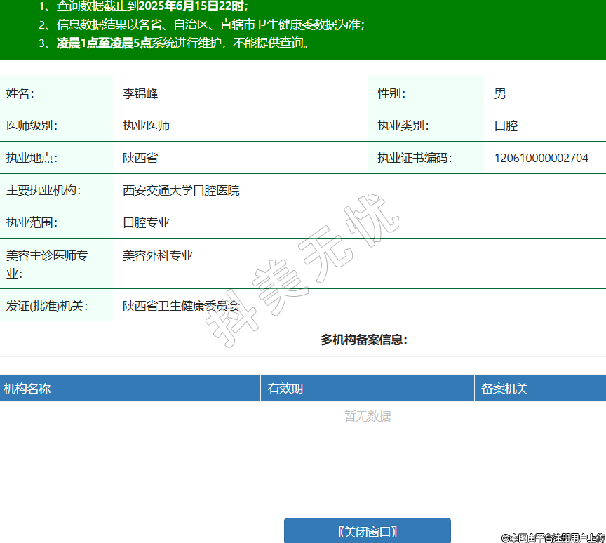 姓名:李錦峰性別:男醫(yī)師級(jí)別:執(zhí)業(yè)醫(yī)師執(zhí)業(yè)類別:口腔執(zhí)業(yè)地點(diǎn):陜西省執(zhí)業(yè)證書編碼:120610000002704主要執(zhí)業(yè)機(jī)構(gòu):西安交通大學(xué)口腔醫(yī)院執(zhí)業(yè)范圍:口腔專業(yè)美容主診醫(yī)師專業(yè):美容外科專業(yè)發(fā)證(批準(zhǔn))機(jī)關(guān):陜西省衛(wèi)生健康委員會(huì) -