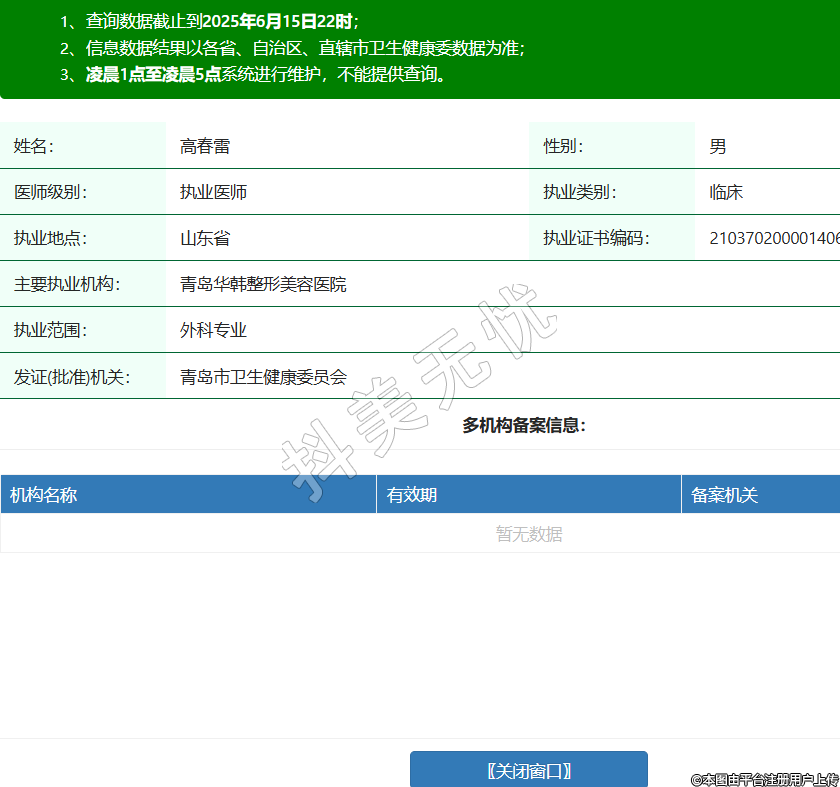 姓名:高春雷性別:男醫(yī)師級(jí)別:執(zhí)業(yè)醫(yī)師執(zhí)業(yè)類別:臨床執(zhí)業(yè)地點(diǎn):山東省執(zhí)業(yè)證書編碼:210370200001406主要執(zhí)業(yè)機(jī)構(gòu):青島華韓整形美容醫(yī)院執(zhí)業(yè)范圍:外科專業(yè)發(fā)證(批準(zhǔn))機(jī)關(guān):青島市衛(wèi)生健康委員會(huì) -