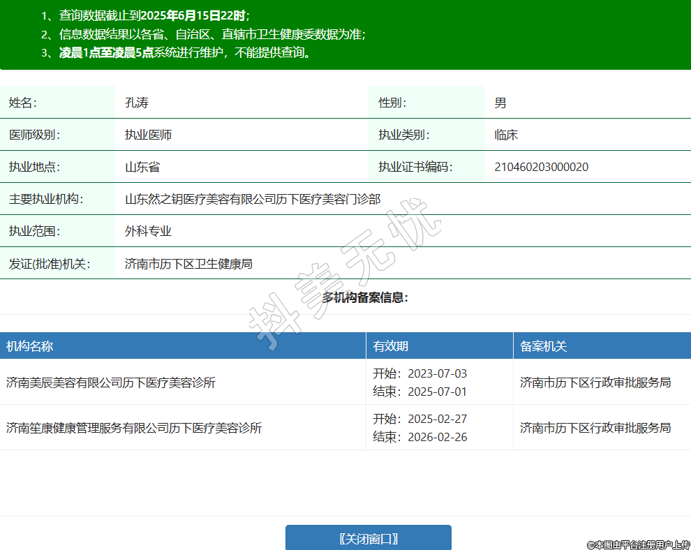 姓名:孔濤性別:男醫(yī)師級(jí)別:執(zhí)業(yè)醫(yī)師執(zhí)業(yè)類別:臨床執(zhí)業(yè)地點(diǎn):山東省執(zhí)業(yè)證書編碼:210460203000020主要執(zhí)業(yè)機(jī)構(gòu):山東然之鑰醫(yī)療美容有限公司歷下醫(yī)療美容門診部執(zhí)業(yè)范圍:外科專業(yè)發(fā)證(批準(zhǔn))機(jī)關(guān):濟(jì)南市歷下區(qū)衛(wèi)生健康局多機(jī)構(gòu)備案信息:機(jī)構(gòu)名稱 有效期 備案機(jī)關(guān) 濟(jì)南美辰美容有限公司歷下醫(yī)療美容診所 開始:2023-07-03結(jié)束:2025-07-01濟(jì)南市歷下區(qū)行政審批服務(wù)局 濟(jì)南笙康健康管理服務(wù)有限公司歷下醫(yī)療美容診所 開始:2025-02-27結(jié)束:2026-02-26濟(jì)南市歷下區(qū)行政審批服務(wù)局 -
