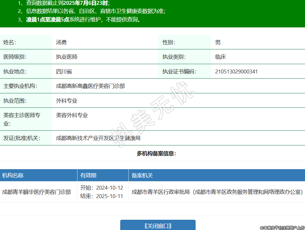 姓名:湯勇性別:男醫(yī)師級別:執(zhí)業(yè)醫(yī)師執(zhí)業(yè)類別:臨床執(zhí)業(yè)地點:四川省執(zhí)業(yè)證書編碼:210513029000341主要執(zhí)業(yè)機構:成都高新高鑫醫(yī)療美容門診部執(zhí)業(yè)范圍:外科專業(yè)美容主診醫(yī)師專業(yè):美容外科專業(yè)發(fā)證(批準)機關:成都高新技術產業(yè)開發(fā)區(qū)衛(wèi)生健康局多機構備案信息:機構名稱 有效期 備案機關 成都青羊瞬華醫(yī)療美容門診部 開始:2024-10-12結束:2025-10-11成都市青羊區(qū)行政審批局(成都市青羊區(qū)政務服務管理和網絡理政辦公室) -