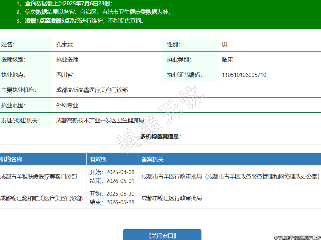 姓名:孔泰霖性別:男醫(yī)師級別:執(zhí)業(yè)醫(yī)師執(zhí)業(yè)類別:臨床執(zhí)業(yè)地點:四川省執(zhí)業(yè)證書編碼:110510106005710主要執(zhí)業(yè)機(jī)構(gòu):成都高新高鑫醫(yī)療美容門診部執(zhí)業(yè)范圍:外科專業(yè)發(fā)證(批準(zhǔn))機(jī)關(guān):成都高新技術(shù)產(chǎn)業(yè)開發(fā)區(qū)衛(wèi)生健康局多機(jī)構(gòu)備案信息:機(jī)構(gòu)名稱 有效期 備案機(jī)關(guān) 成都青羊雅膚媛醫(yī)療美容門診部 開始:2025-04-08結(jié)束:2026-05-01成都市青羊區(qū)行政審批局(成都市青羊區(qū)政務(wù)服務(wù)管理和網(wǎng)絡(luò)理政辦公室) 成都錦江懿和唯美醫(yī)療美容門診部 開始:2025-05-30結(jié)束:2026-05-28成都市錦江區(qū)行政審批局 -