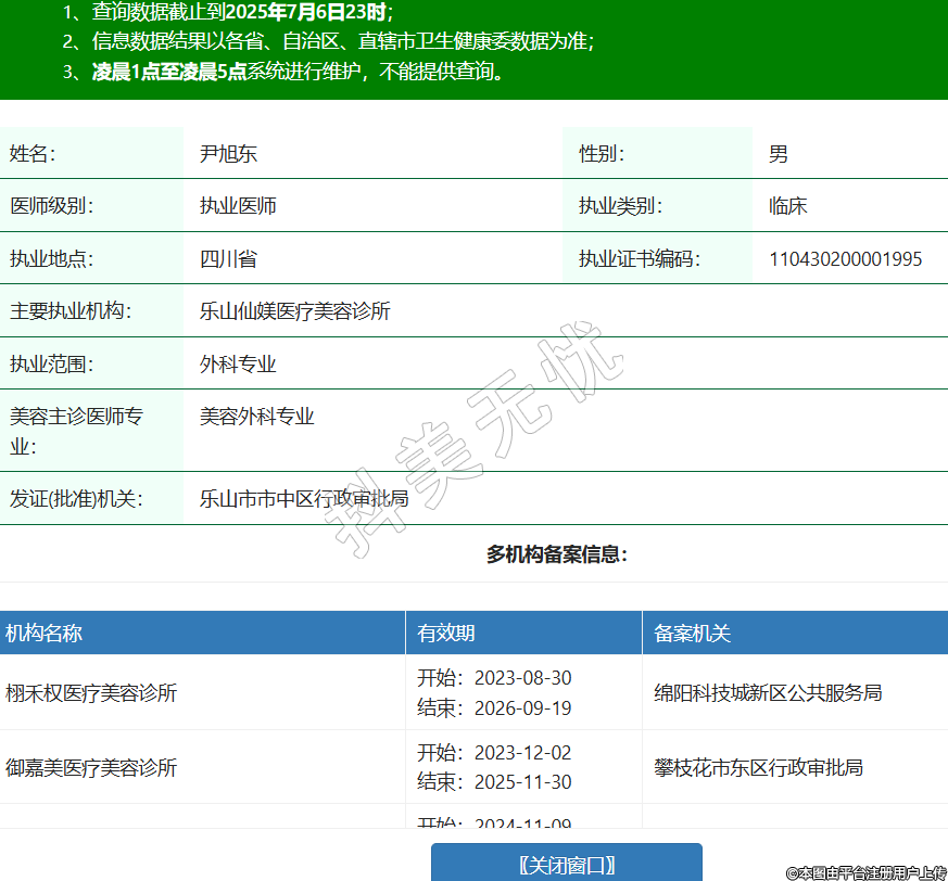 姓名:尹旭東性別:男醫(yī)師級別:執(zhí)業(yè)醫(yī)師執(zhí)業(yè)類別:臨床執(zhí)業(yè)地點:四川省執(zhí)業(yè)證書編碼:110430200001995主要執(zhí)業(yè)機構:樂山仙媄醫(yī)療美容診所執(zhí)業(yè)范圍:外科專業(yè)美容主診醫(yī)師專業(yè):美容外科專業(yè)發(fā)證(批準)機關:樂山市市中區(qū)行政審批局多機構備案信息:機構名稱 有效期 備案機關 栩禾權醫(yī)療美容診所 開始:2023-08-30結束:2026-09-19綿陽科技城新區(qū)公共服務局 御嘉美醫(yī)療美容診所 開始:2023-12-02結束:2025-11-30攀枝花市東區(qū)行政審批局 成都金牛萊瑞拉威塑醫(yī)療美容醫(yī)院 開始:2024-11-09結束:2029-11-15成都市金牛區(qū)政務服務管理和行政審批局 攀枝花星妍醫(yī)療美容診所 開始:2025-02-10結束:2029-02-09攀枝花市東區(qū)行政審批局 成都高新高鑫醫(yī)療美容門診部 開始:2025-02-13結束:2028-02-11成都高新技術產業(yè)開發(fā)區(qū)衛(wèi)生健康局 -