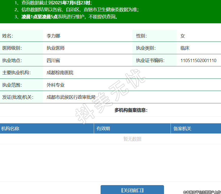 姓名:李力娜性別:女醫(yī)師級(jí)別:執(zhí)業(yè)醫(yī)師執(zhí)業(yè)類(lèi)別:臨床執(zhí)業(yè)地點(diǎn):四川省執(zhí)業(yè)證書(shū)編碼:110511502001110主要執(zhí)業(yè)機(jī)構(gòu):成都棕南醫(yī)院執(zhí)業(yè)范圍:外科專(zhuān)業(yè)發(fā)證(批準(zhǔn))機(jī)關(guān):成都市武侯區(qū)行政審批局 -