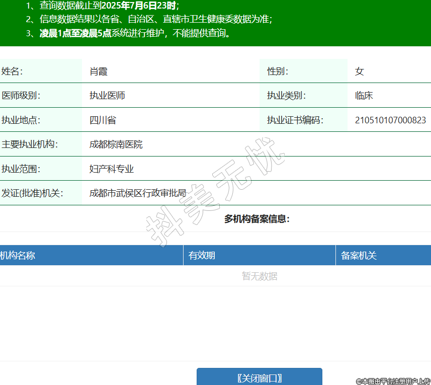 姓名:肖霞性別:女醫(yī)師級(jí)別:執(zhí)業(yè)醫(yī)師執(zhí)業(yè)類別:臨床執(zhí)業(yè)地點(diǎn):四川省執(zhí)業(yè)證書(shū)編碼:210510107000823主要執(zhí)業(yè)機(jī)構(gòu):成都棕南醫(yī)院執(zhí)業(yè)范圍:婦產(chǎn)科專業(yè)發(fā)證(批準(zhǔn))機(jī)關(guān):成都市武侯區(qū)行政審批局 -