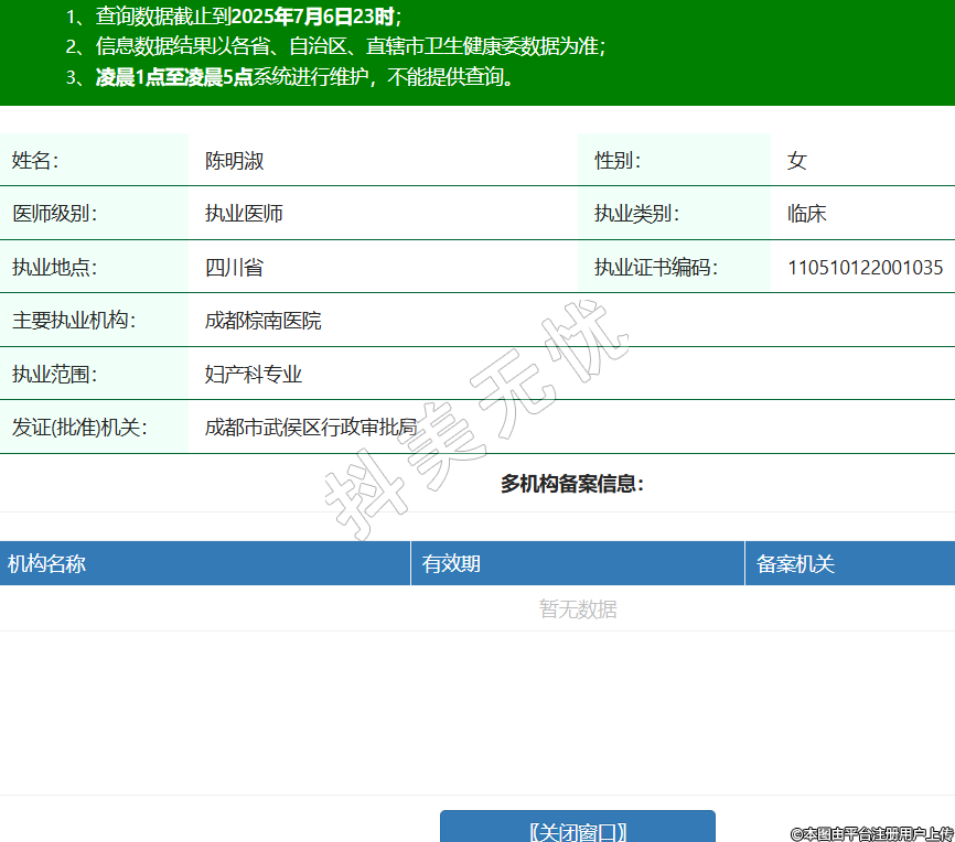 姓名:陳明淑性別:女醫(yī)師級(jí)別:執(zhí)業(yè)醫(yī)師執(zhí)業(yè)類別:臨床執(zhí)業(yè)地點(diǎn):四川省執(zhí)業(yè)證書(shū)編碼:110510122001035主要執(zhí)業(yè)機(jī)構(gòu):成都棕南醫(yī)院執(zhí)業(yè)范圍:婦產(chǎn)科專業(yè)發(fā)證(批準(zhǔn))機(jī)關(guān):成都市武侯區(qū)行政審批局 -