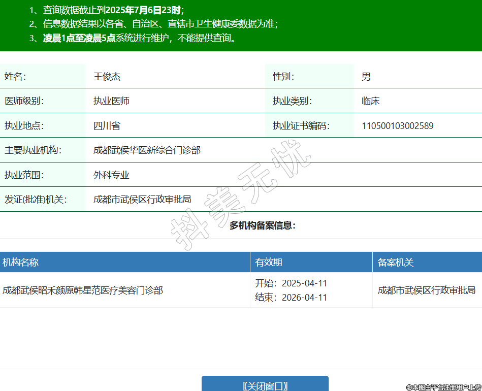 姓名:王俊杰性別:男醫(yī)師級(jí)別:執(zhí)業(yè)醫(yī)師執(zhí)業(yè)類別:臨床執(zhí)業(yè)地點(diǎn):四川省執(zhí)業(yè)證書編碼:110500103002589主要執(zhí)業(yè)機(jī)構(gòu):成都武侯華醫(yī)新綜合門診部執(zhí)業(yè)范圍:外科專業(yè)發(fā)證(批準(zhǔn))機(jī)關(guān):成都市武侯區(qū)行政審批局多機(jī)構(gòu)備案信息:機(jī)構(gòu)名稱 有效期 備案機(jī)關(guān) 成都武侯昭禾顏原韓星范醫(yī)療美容門診部 開始:2025-04-11結(jié)束:2026-04-11成都市武侯區(qū)行政審批局 -