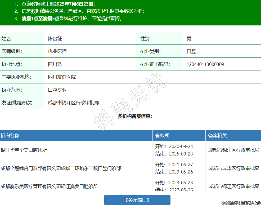姓名:陳貴征性別:男醫(yī)師級別:執(zhí)業(yè)醫(yī)師執(zhí)業(yè)類別:口腔執(zhí)業(yè)地點:四川省執(zhí)業(yè)證書編碼:120440113000309主要執(zhí)業(yè)機構:四川友誼醫(yī)院執(zhí)業(yè)范圍:口腔專業(yè)發(fā)證(批準)機關:成都市錦江區(qū)行政審批局多機構備案信息:機構名稱 有效期 備案機關 錦江華宇華美口腔診所 開始:2020-09-24結束:2025-09-23成都市錦江區(qū)行政審批局 成都企鵝綜合門診部有限公司成華二環(huán)路東二段口腔門診部 開始:2021-05-27結束:2029-05-26成都市成華區(qū)行政審批局 成都澳樂美醫(yī)療管理有限公司錦江澳美口腔診所 開始:2023-05-23結束:2027-05-26成都市錦江區(qū)行政審批局 -