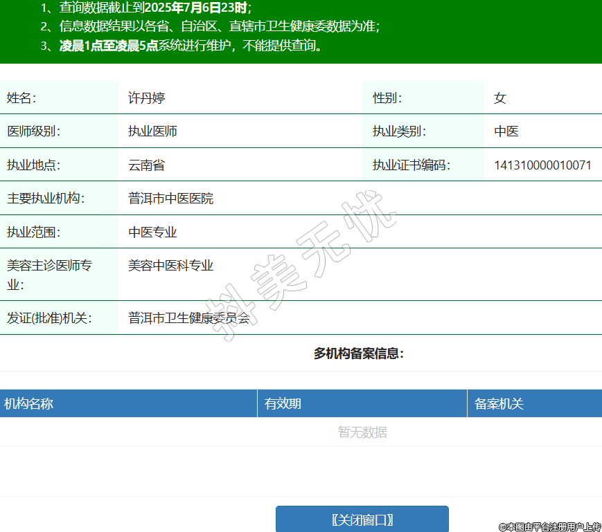 姓名:許丹婷性別:女醫(yī)師級別:執(zhí)業(yè)醫(yī)師執(zhí)業(yè)類別:中醫(yī)執(zhí)業(yè)地點:云南省執(zhí)業(yè)證書編碼:141310000010071主要執(zhí)業(yè)機構:普洱市中醫(yī)醫(yī)院執(zhí)業(yè)范圍:中醫(yī)專業(yè)美容主診醫(yī)師專業(yè):美容中醫(yī)科專業(yè)發(fā)證(批準)機關:普洱市衛(wèi)生健康委員會 -
