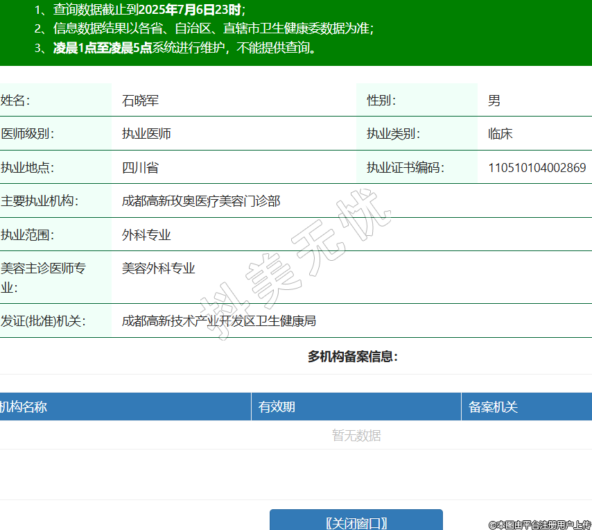 姓名:石曉軍性別:男醫(yī)師級(jí)別:執(zhí)業(yè)醫(yī)師執(zhí)業(yè)類別:臨床執(zhí)業(yè)地點(diǎn):四川省執(zhí)業(yè)證書(shū)編碼:110510104002869主要執(zhí)業(yè)機(jī)構(gòu):成都高新玫奧醫(yī)療美容門(mén)診部執(zhí)業(yè)范圍:外科專業(yè)美容主診醫(yī)師專業(yè):美容外科專業(yè)發(fā)證(批準(zhǔn))機(jī)關(guān):成都高新技術(shù)產(chǎn)業(yè)開(kāi)發(fā)區(qū)衛(wèi)生健康局 -