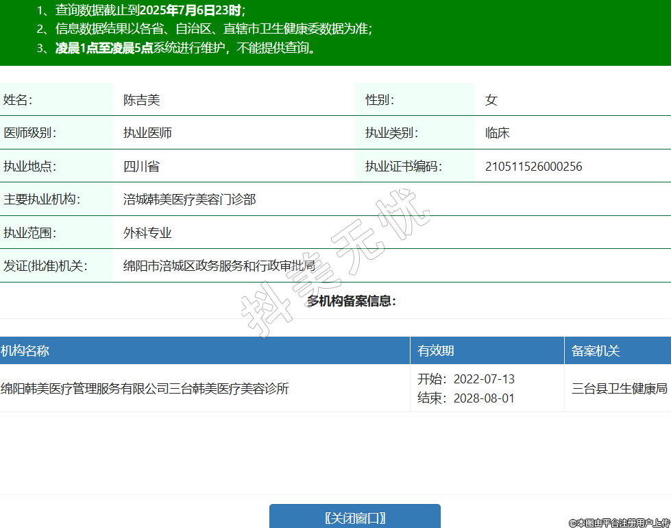姓名:陳吉美性別:女醫(yī)師級別:執(zhí)業(yè)醫(yī)師執(zhí)業(yè)類別:臨床執(zhí)業(yè)地點:四川省執(zhí)業(yè)證書編碼:210511526000256主要執(zhí)業(yè)機構(gòu):涪城韓美醫(yī)療美容門診部執(zhí)業(yè)范圍:外科專業(yè)發(fā)證(批準)機關:綿陽市涪城區(qū)政務服務和行政審批局多機構(gòu)備案信息:機構(gòu)名稱 有效期 備案機關 綿陽韓美醫(yī)療管理服務有限公司三臺韓美醫(yī)療美容診所 開始:2022-07-13結(jié)束:2028-08-01三臺縣衛(wèi)生健康局 -