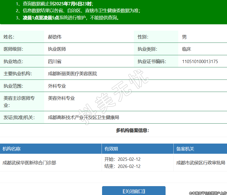 姓名:郝勁偉性別:男醫(yī)師級別:執(zhí)業(yè)醫(yī)師執(zhí)業(yè)類別:臨床執(zhí)業(yè)地點:四川省執(zhí)業(yè)證書編碼:110510100013175主要執(zhí)業(yè)機構:成都新麗美醫(yī)療美容醫(yī)院執(zhí)業(yè)范圍:外科專業(yè)美容主診醫(yī)師專業(yè):美容外科專業(yè)發(fā)證(批準)機關:成都高新技術產業(yè)開發(fā)區(qū)衛(wèi)生健康局多機構備案信息:機構名稱 有效期 備案機關 成都武侯華醫(yī)新綜合門診部 開始:2025-02-12結束:2026-02-12成都市武侯區(qū)行政審批局 -