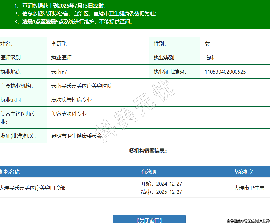 姓名:李奇飛性別:女醫(yī)師級別:執(zhí)業(yè)醫(yī)師執(zhí)業(yè)類別:臨床執(zhí)業(yè)地點(diǎn):云南省執(zhí)業(yè)證書編碼:110530402000525主要執(zhí)業(yè)機(jī)構(gòu):云南吳氏嘉美醫(yī)療美容醫(yī)院執(zhí)業(yè)范圍:皮膚病與性病專業(yè)美容主診醫(yī)師專業(yè):美容皮膚科專業(yè)發(fā)證(批準(zhǔn))機(jī)關(guān):昆明市衛(wèi)生健康委員會多機(jī)構(gòu)備案信息:機(jī)構(gòu)名稱 有效期 備案機(jī)關(guān) 大理吳氏嘉美醫(yī)療美容門診部 開始:2024-12-27結(jié)束:2025-12-27大理市衛(wèi)生局 -