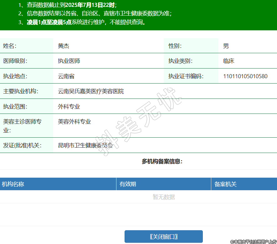 姓名:黃杰性別:男醫(yī)師級(jí)別:執(zhí)業(yè)醫(yī)師執(zhí)業(yè)類(lèi)別:臨床執(zhí)業(yè)地點(diǎn):云南省執(zhí)業(yè)證書(shū)編碼:110110105010580主要執(zhí)業(yè)機(jī)構(gòu):云南吳氏嘉美醫(yī)療美容醫(yī)院執(zhí)業(yè)范圍:外科專(zhuān)業(yè)美容主診醫(yī)師專(zhuān)業(yè):美容外科專(zhuān)業(yè)發(fā)證(批準(zhǔn))機(jī)關(guān):昆明市衛(wèi)生健康委員會(huì) -
