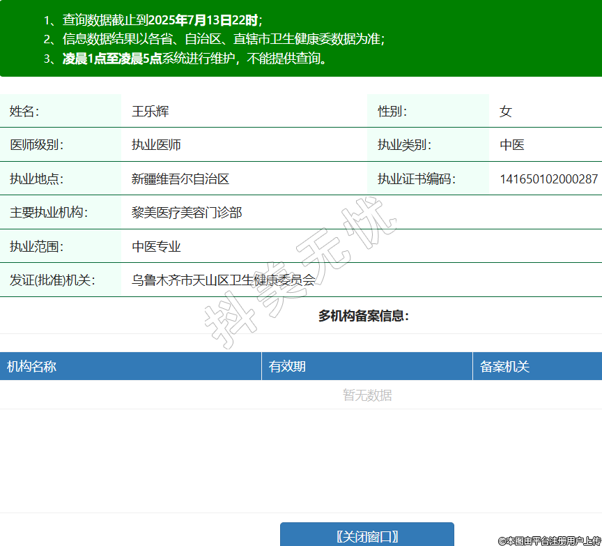 姓名:王樂輝性別:女醫(yī)師級(jí)別:執(zhí)業(yè)醫(yī)師執(zhí)業(yè)類別:中醫(yī)執(zhí)業(yè)地點(diǎn):新疆維吾爾自治區(qū)執(zhí)業(yè)證書編碼:141650102000287主要執(zhí)業(yè)機(jī)構(gòu):黎美醫(yī)療美容門診部執(zhí)業(yè)范圍:中醫(yī)專業(yè)發(fā)證(批準(zhǔn))機(jī)關(guān):烏魯木齊市天山區(qū)衛(wèi)生健康委員會(huì) -