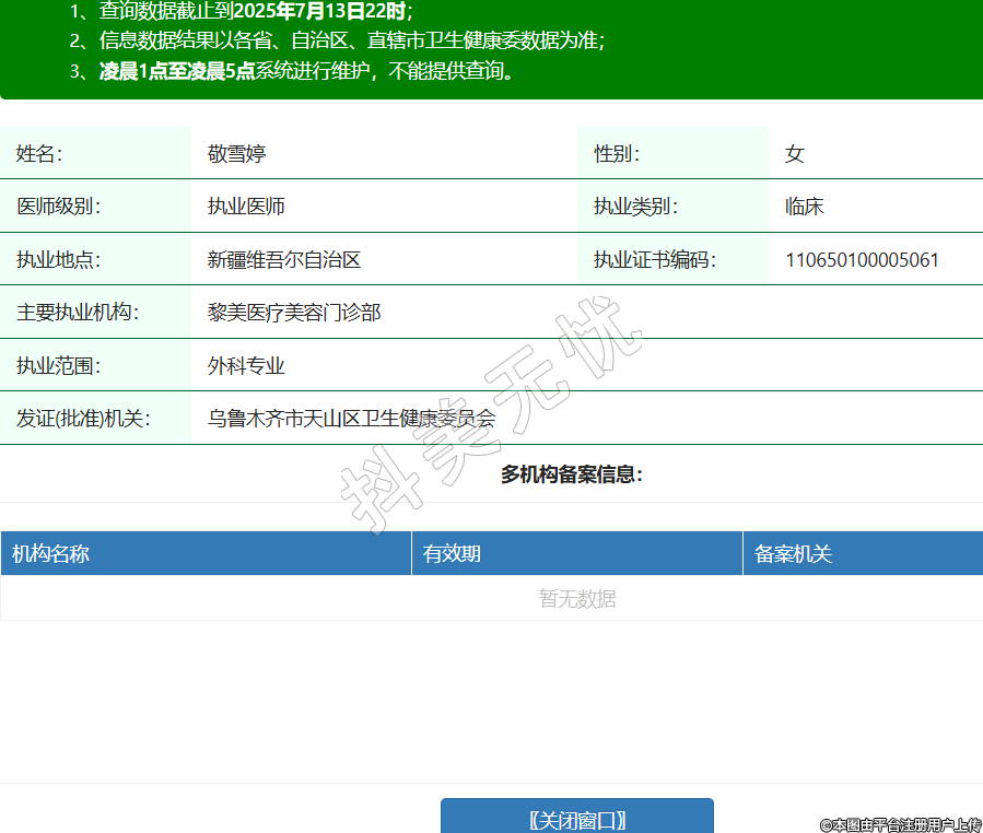 姓名:敬雪婷性別:女醫(yī)師級(jí)別:執(zhí)業(yè)醫(yī)師執(zhí)業(yè)類別:臨床執(zhí)業(yè)地點(diǎn):新疆維吾爾自治區(qū)執(zhí)業(yè)證書(shū)編碼:110650100005061主要執(zhí)業(yè)機(jī)構(gòu):黎美醫(yī)療美容門(mén)診部執(zhí)業(yè)范圍:外科專業(yè)發(fā)證(批準(zhǔn))機(jī)關(guān):烏魯木齊市天山區(qū)衛(wèi)生健康委員會(huì) -