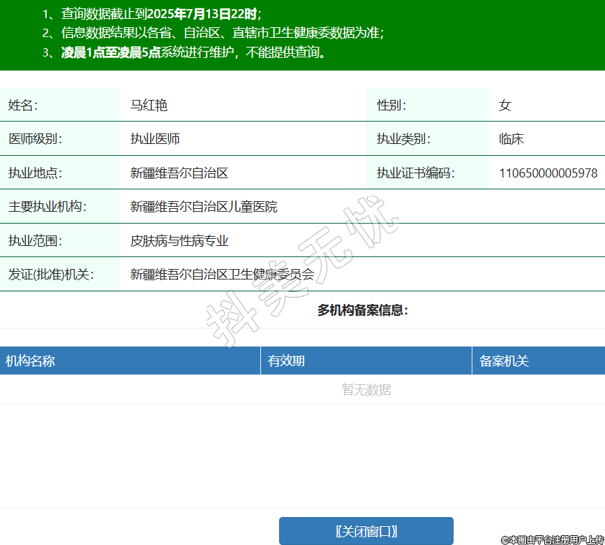 姓名:馬紅艷性別:女醫(yī)師級別:執(zhí)業(yè)醫(yī)師執(zhí)業(yè)類別:臨床執(zhí)業(yè)地點:新疆維吾爾自治區(qū)執(zhí)業(yè)證書編碼:110650000005978主要執(zhí)業(yè)機構:新疆維吾爾自治區(qū)兒童醫(yī)院執(zhí)業(yè)范圍:皮膚病與性病專業(yè)發(fā)證(批準)機關:新疆維吾爾自治區(qū)衛(wèi)生健康委員會 -
