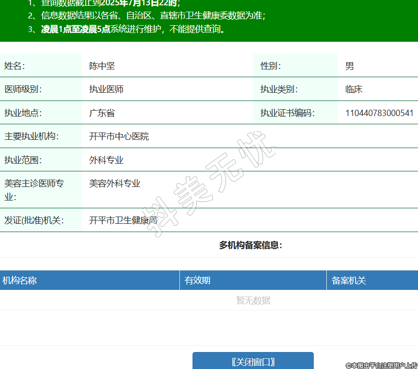 姓名:陳中堅性別:男醫(yī)師級別:執(zhí)業(yè)醫(yī)師執(zhí)業(yè)類別:臨床執(zhí)業(yè)地點:廣東省執(zhí)業(yè)證書編碼:110440783000541主要執(zhí)業(yè)機構(gòu):開平市中心醫(yī)院執(zhí)業(yè)范圍:外科專業(yè)美容主診醫(yī)師專業(yè):美容外科專業(yè)發(fā)證(批準)機關(guān):開平市衛(wèi)生健康局 -