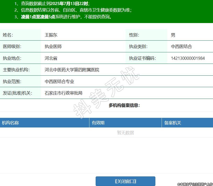 姓名:王振東性別:男醫(yī)師級別:執(zhí)業(yè)醫(yī)師執(zhí)業(yè)類別:中西醫(yī)結(jié)合執(zhí)業(yè)地點:河北省執(zhí)業(yè)證書編碼:142130000001984主要執(zhí)業(yè)機構(gòu):河北中醫(yī)藥大學(xué)第四附屬醫(yī)院執(zhí)業(yè)范圍:中西醫(yī)結(jié)合專業(yè)發(fā)證(批準(zhǔn))機關(guān):石家莊市行政審批局 -
