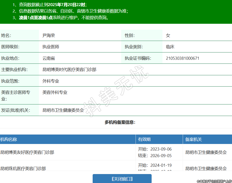 姓名:尹海榮性別:女醫(yī)師級別:執(zhí)業(yè)醫(yī)師執(zhí)業(yè)類別:臨床執(zhí)業(yè)地點:云南省執(zhí)業(yè)證書編碼:210530381000671主要執(zhí)業(yè)機構(gòu):昆明博美時代醫(yī)療美容門診部執(zhí)業(yè)范圍:外科專業(yè)美容主診醫(yī)師專業(yè):美容外科專業(yè)發(fā)證(批準(zhǔn))機關(guān):昆明市衛(wèi)生健康委員會多機構(gòu)備案信息:機構(gòu)名稱 有效期 備案機關(guān) 昆明博美友好醫(yī)療美容門診部 開始:2023-09-06結(jié)束:2026-09-05昆明市衛(wèi)生健康委員會 昆明珠璣醫(yī)療美容門診部 開始:2024-01-19結(jié)束:2025-12-18昆明市衛(wèi)生健康委員會 云南比爾西希生物科技有限公司盤龍麗水雅苑醫(yī)療美容診所 開始:2024-06-14結(jié)束:2027-06-14昆明市盤龍區(qū)衛(wèi)生健康局 紅河博美醫(yī)療美容門診部 開始:2025-05-15結(jié)束:2026-05-14蒙自市衛(wèi)生健康局 -