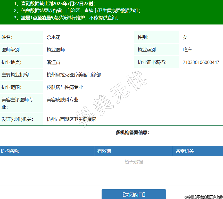 姓名:余水花性別:女醫(yī)師級別:執(zhí)業(yè)醫(yī)師執(zhí)業(yè)類別:臨床執(zhí)業(yè)地點(diǎn):浙江省執(zhí)業(yè)證書編碼:210330106000447主要執(zhí)業(yè)機(jī)構(gòu):杭州奧拉克醫(yī)療美容門診部執(zhí)業(yè)范圍:皮膚病與性病專業(yè)美容主診醫(yī)師專業(yè):美容皮膚科專業(yè)發(fā)證(批準(zhǔn))機(jī)關(guān):杭州市西湖區(qū)衛(wèi)生健康局 -