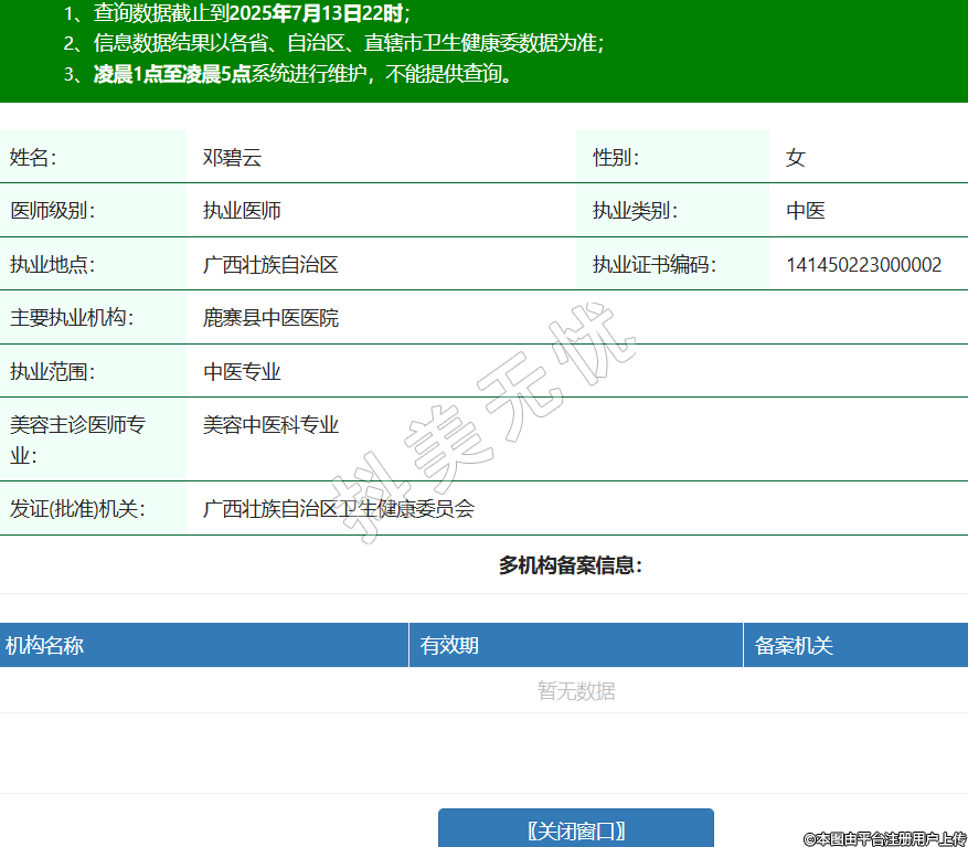 姓名:鄧碧云性別:女醫(yī)師級別:執(zhí)業(yè)醫(yī)師執(zhí)業(yè)類別:中醫(yī)執(zhí)業(yè)地點(diǎn):廣西壯族自治區(qū)執(zhí)業(yè)證書編碼:141450223000002主要執(zhí)業(yè)機(jī)構(gòu):鹿寨縣中醫(yī)醫(yī)院執(zhí)業(yè)范圍:中醫(yī)專業(yè)美容主診醫(yī)師專業(yè):美容中醫(yī)科專業(yè)發(fā)證(批準(zhǔn))機(jī)關(guān):廣西壯族自治區(qū)衛(wèi)生健康委員會 -