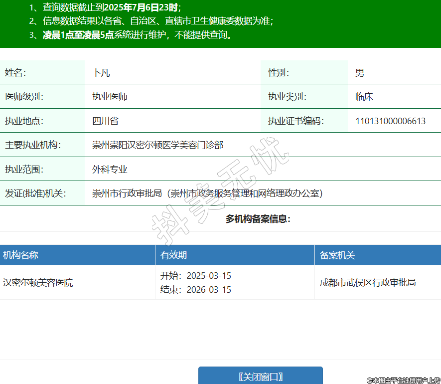 姓名:卜凡性別:男醫(yī)師級(jí)別:執(zhí)業(yè)醫(yī)師執(zhí)業(yè)類別:臨床執(zhí)業(yè)地點(diǎn):四川省執(zhí)業(yè)證書編碼:110131000006613主要執(zhí)業(yè)機(jī)構(gòu):崇州崇陽漢密爾頓醫(yī)學(xué)美容門診部執(zhí)業(yè)范圍:外科專業(yè)發(fā)證(批準(zhǔn))機(jī)關(guān):崇州市行政審批局(崇州市政務(wù)服務(wù)管理和網(wǎng)絡(luò)理政辦公室)多機(jī)構(gòu)備案信息:機(jī)構(gòu)名稱 有效期 備案機(jī)關(guān) 漢密爾頓美容醫(yī)院 開始:2025-03-15結(jié)束:2026-03-15成都市武侯區(qū)行政審批局 -