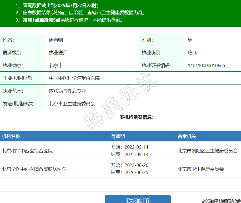 姓名:周海嘯性別:男醫(yī)師級(jí)別:執(zhí)業(yè)醫(yī)師執(zhí)業(yè)類別:臨床執(zhí)業(yè)地點(diǎn):北京市執(zhí)業(yè)證書(shū)編碼:110110000010665主要執(zhí)業(yè)機(jī)構(gòu):中國(guó)中醫(yī)科學(xué)院望京醫(yī)院執(zhí)業(yè)范圍:皮膚病與性病專業(yè)發(fā)證(批準(zhǔn))機(jī)關(guān):北京市衛(wèi)生健康委員會(huì)多機(jī)構(gòu)備案信息:機(jī)構(gòu)名稱 有效期 備案機(jī)關(guān) 北京和平中西醫(yī)結(jié)合醫(yī)院 開(kāi)始:2022-09-14結(jié)束:2025-09-13北京市朝陽(yáng)區(qū)衛(wèi)生健康委員會(huì) 北京華醫(yī)中西醫(yī)結(jié)合皮膚病醫(yī)院 開(kāi)始:2023-06-26結(jié)束:2026-06-25北京市衛(wèi)生健康委員會(huì) -