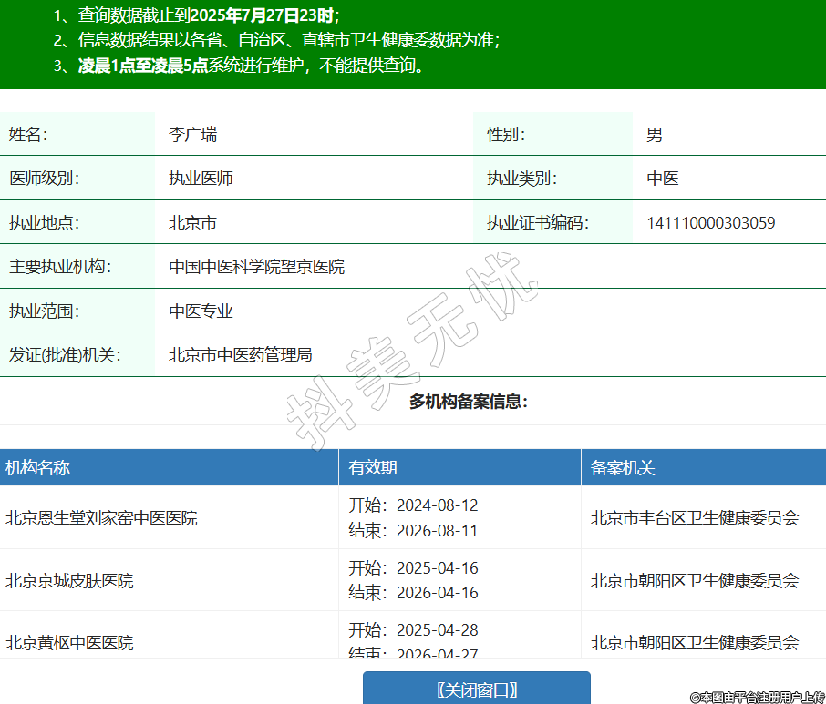 姓名:李廣瑞性別:男醫(yī)師級別:執(zhí)業(yè)醫(yī)師執(zhí)業(yè)類別:中醫(yī)執(zhí)業(yè)地點(diǎn):北京市執(zhí)業(yè)證書編碼:141110000303059主要執(zhí)業(yè)機(jī)構(gòu):中國中醫(yī)科學(xué)院望京醫(yī)院執(zhí)業(yè)范圍:中醫(yī)專業(yè)發(fā)證(批準(zhǔn))機(jī)關(guān):北京市中醫(yī)藥管理局多機(jī)構(gòu)備案信息:機(jī)構(gòu)名稱 有效期 備案機(jī)關(guān) 北京恩生堂劉家窯中醫(yī)醫(yī)院 開始:2024-08-12結(jié)束:2026-08-11北京市豐臺區(qū)衛(wèi)生健康委員會 北京京城皮膚醫(yī)院 開始:2025-04-16結(jié)束:2026-04-16北京市朝陽區(qū)衛(wèi)生健康委員會 北京黃樞中醫(yī)醫(yī)院 開始:2025-04-28結(jié)束:2026-04-27北京市朝陽區(qū)衛(wèi)生健康委員會 -