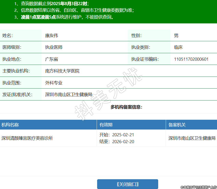 姓名:康友偉性別:男醫(yī)師級(jí)別:執(zhí)業(yè)醫(yī)師執(zhí)業(yè)類(lèi)別:臨床執(zhí)業(yè)地點(diǎn):廣東省執(zhí)業(yè)證書(shū)編碼:110511702000601主要執(zhí)業(yè)機(jī)構(gòu):南方科技大學(xué)醫(yī)院執(zhí)業(yè)范圍:外科專(zhuān)業(yè)發(fā)證(批準(zhǔn))機(jī)關(guān):深圳市南山區(qū)衛(wèi)生健康局多機(jī)構(gòu)備案信息:機(jī)構(gòu)名稱(chēng) 有效期 備案機(jī)關(guān) 深圳清顏臻宜醫(yī)療美容診所 開(kāi)始:2025-02-21結(jié)束:2026-02-20深圳市南山區(qū)衛(wèi)生健康局 -