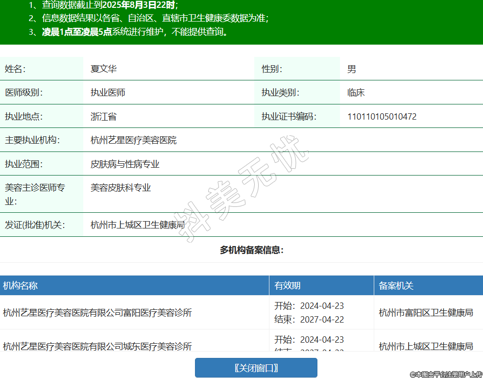 姓名:夏文華性別:男醫(yī)師級別:執(zhí)業(yè)醫(yī)師執(zhí)業(yè)類別:臨床執(zhí)業(yè)地點:浙江省執(zhí)業(yè)證書編碼:110110105010472主要執(zhí)業(yè)機構(gòu):杭州藝星醫(yī)療美容醫(yī)院執(zhí)業(yè)范圍:皮膚病與性病專業(yè)美容主診醫(yī)師專業(yè):美容皮膚科專業(yè)發(fā)證(批準)機關(guān):杭州市上城區(qū)衛(wèi)生健康局多機構(gòu)備案信息:機構(gòu)名稱 有效期 備案機關(guān) 杭州藝星醫(yī)療美容醫(yī)院有限公司富陽醫(yī)療美容診所 開始:2024-04-23結(jié)束:2027-04-22杭州市富陽區(qū)衛(wèi)生健康局 杭州藝星醫(yī)療美容醫(yī)院有限公司城東醫(yī)療美容診所 開始:2024-04-23結(jié)束:2027-04-22杭州市上城區(qū)衛(wèi)生健康局 杭州藝星醫(yī)療美容醫(yī)院有限公司城西醫(yī)療美容門診部 開始:2024-04-23結(jié)束:2027-04-22杭州市西湖區(qū)衛(wèi)生健康局 杭州藝星醫(yī)療美容醫(yī)院有限公司余杭醫(yī)療美容診所 開始:2025-01-08結(jié)束:2028-01-07杭州市余杭區(qū)衛(wèi)生健康局 -