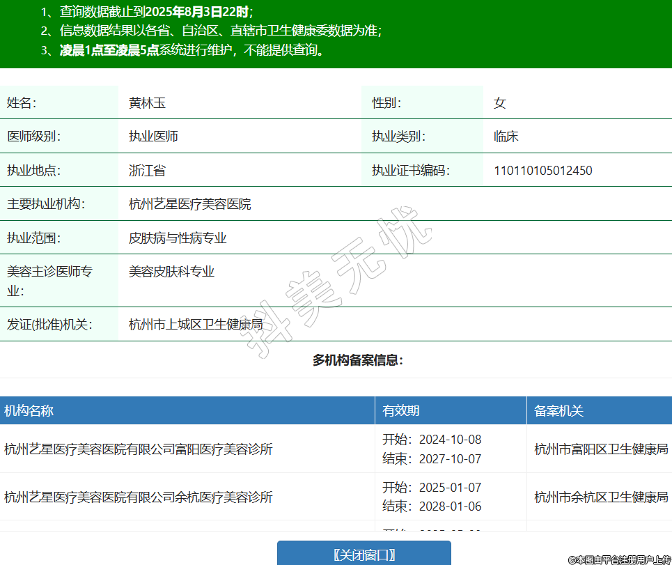 姓名:黃林玉性別:女醫(yī)師級(jí)別:執(zhí)業(yè)醫(yī)師執(zhí)業(yè)類別:臨床執(zhí)業(yè)地點(diǎn):浙江省執(zhí)業(yè)證書編碼:110110105012450主要執(zhí)業(yè)機(jī)構(gòu):杭州藝星醫(yī)療美容醫(yī)院執(zhí)業(yè)范圍:皮膚病與性病專業(yè)美容主診醫(yī)師專業(yè):美容皮膚科專業(yè)發(fā)證(批準(zhǔn))機(jī)關(guān):杭州市上城區(qū)衛(wèi)生健康局多機(jī)構(gòu)備案信息:機(jī)構(gòu)名稱 有效期 備案機(jī)關(guān) 杭州藝星醫(yī)療美容醫(yī)院有限公司富陽醫(yī)療美容診所 開始:2024-10-08結(jié)束:2027-10-07杭州市富陽區(qū)衛(wèi)生健康局 杭州藝星醫(yī)療美容醫(yī)院有限公司余杭醫(yī)療美容診所 開始:2025-01-07結(jié)束:2028-01-06杭州市余杭區(qū)衛(wèi)生健康局 杭州藝星醫(yī)療美容醫(yī)院有限公司城北醫(yī)療美容診所 開始:2025-05-08結(jié)束:2028-05-07杭州市拱墅區(qū)衛(wèi)生健康局 杭州藝星醫(yī)療美容醫(yī)院有限公司城東醫(yī)療美容診所 開始:2025-07-24結(jié)束:2028-07-23杭州市上城區(qū)衛(wèi)生健康局 -