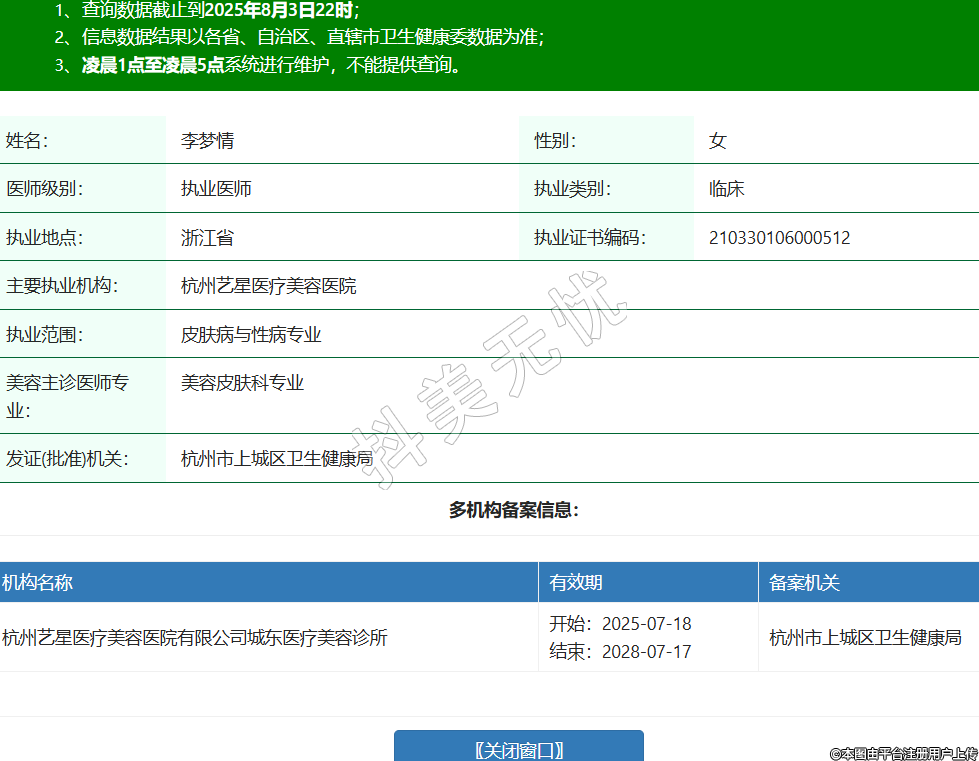姓名:李夢(mèng)情性別:女醫(yī)師級(jí)別:執(zhí)業(yè)醫(yī)師執(zhí)業(yè)類別:臨床執(zhí)業(yè)地點(diǎn):浙江省執(zhí)業(yè)證書(shū)編碼:210330106000512主要執(zhí)業(yè)機(jī)構(gòu):杭州藝星醫(yī)療美容醫(yī)院執(zhí)業(yè)范圍:皮膚病與性病專業(yè)美容主診醫(yī)師專業(yè):美容皮膚科專業(yè)發(fā)證(批準(zhǔn))機(jī)關(guān):杭州市上城區(qū)衛(wèi)生健康局多機(jī)構(gòu)備案信息:機(jī)構(gòu)名稱 有效期 備案機(jī)關(guān) 杭州藝星醫(yī)療美容醫(yī)院有限公司城東醫(yī)療美容診所 開(kāi)始:2025-07-18結(jié)束:2028-07-17杭州市上城區(qū)衛(wèi)生健康局 -