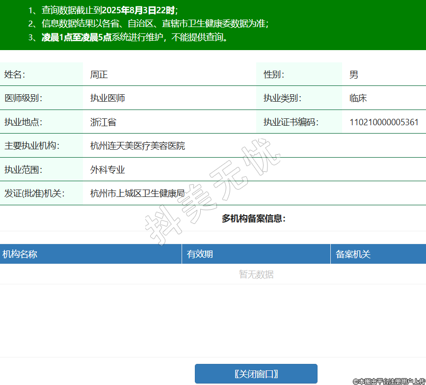 姓名:周正性別:男醫(yī)師級(jí)別:執(zhí)業(yè)醫(yī)師執(zhí)業(yè)類別:臨床執(zhí)業(yè)地點(diǎn):浙江省執(zhí)業(yè)證書編碼:110210000005361主要執(zhí)業(yè)機(jī)構(gòu):杭州連天美醫(yī)療美容醫(yī)院執(zhí)業(yè)范圍:外科專業(yè)發(fā)證(批準(zhǔn))機(jī)關(guān):杭州市上城區(qū)衛(wèi)生健康局 -