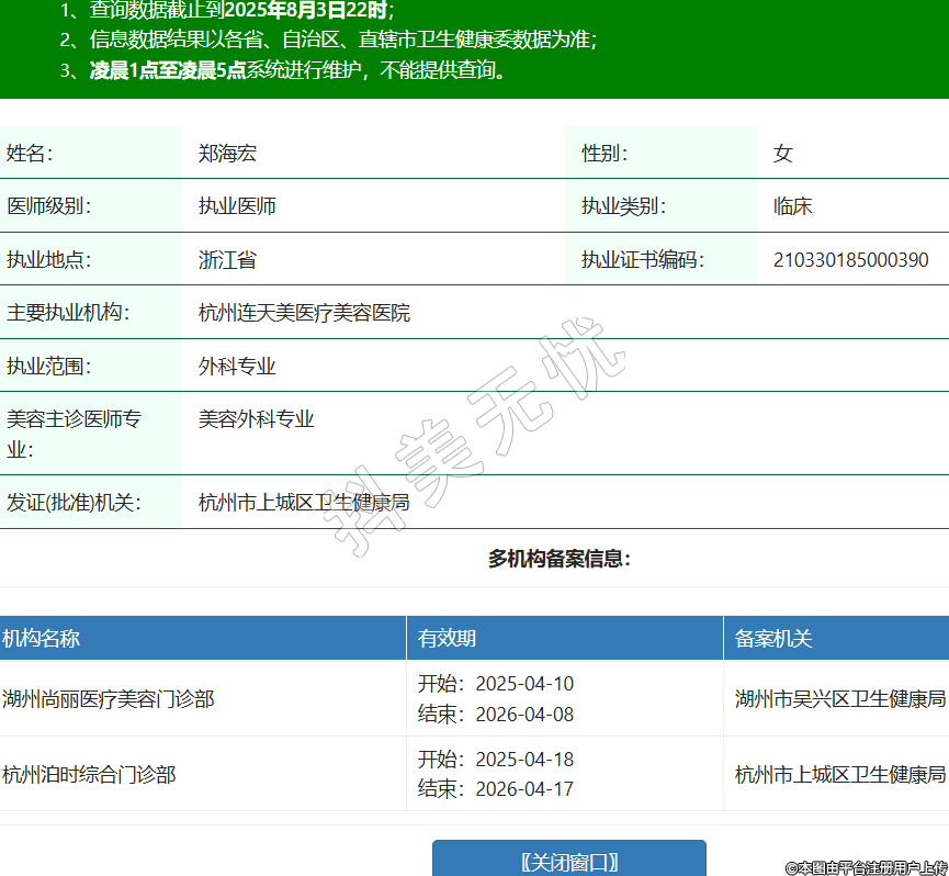 姓名:鄭海宏性別:女醫(yī)師級別:執(zhí)業(yè)醫(yī)師執(zhí)業(yè)類別:臨床執(zhí)業(yè)地點(diǎn):浙江省執(zhí)業(yè)證書編碼:210330185000390主要執(zhí)業(yè)機(jī)構(gòu):杭州連天美醫(yī)療美容醫(yī)院執(zhí)業(yè)范圍:外科專業(yè)美容主診醫(yī)師專業(yè):美容外科專業(yè)發(fā)證(批準(zhǔn))機(jī)關(guān):杭州市上城區(qū)衛(wèi)生健康局多機(jī)構(gòu)備案信息:機(jī)構(gòu)名稱 有效期 備案機(jī)關(guān) 湖州尚麗醫(yī)療美容門診部 開始:2025-04-10結(jié)束:2026-04-08湖州市吳興區(qū)衛(wèi)生健康局 杭州泊時綜合門診部 開始:2025-04-18結(jié)束:2026-04-17杭州市上城區(qū)衛(wèi)生健康局 -