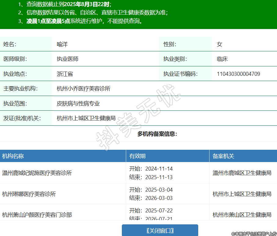 名:喻洋性別:女醫(yī)師級別:執(zhí)業(yè)醫(yī)師執(zhí)業(yè)類別:臨床執(zhí)業(yè)地點:浙江省執(zhí)業(yè)證書編碼:110430300004709主要執(zhí)業(yè)機構(gòu):杭州小喬醫(yī)療美容診所執(zhí)業(yè)范圍:皮膚病與性病專業(yè)發(fā)證(批準(zhǔn))機關(guān):杭州市上城區(qū)衛(wèi)生健康局多機構(gòu)備案信息:機構(gòu)名稱 有效期 備案機關(guān) 溫州鹿城妃妮施醫(yī)療美容診所 開始:2024-11-14結(jié)束:2025-11-13溫州市鹿城區(qū)衛(wèi)生健康局 杭州琳娜醫(yī)療美容診所 開始:2025-03-04結(jié)束:2026-03-03杭州市上城區(qū)衛(wèi)生健康局 杭州蕭山滬顏醫(yī)療美容門診部 開始:2025-07-22結(jié)束:2026-07-21杭州市蕭山區(qū)衛(wèi)生健康局 -