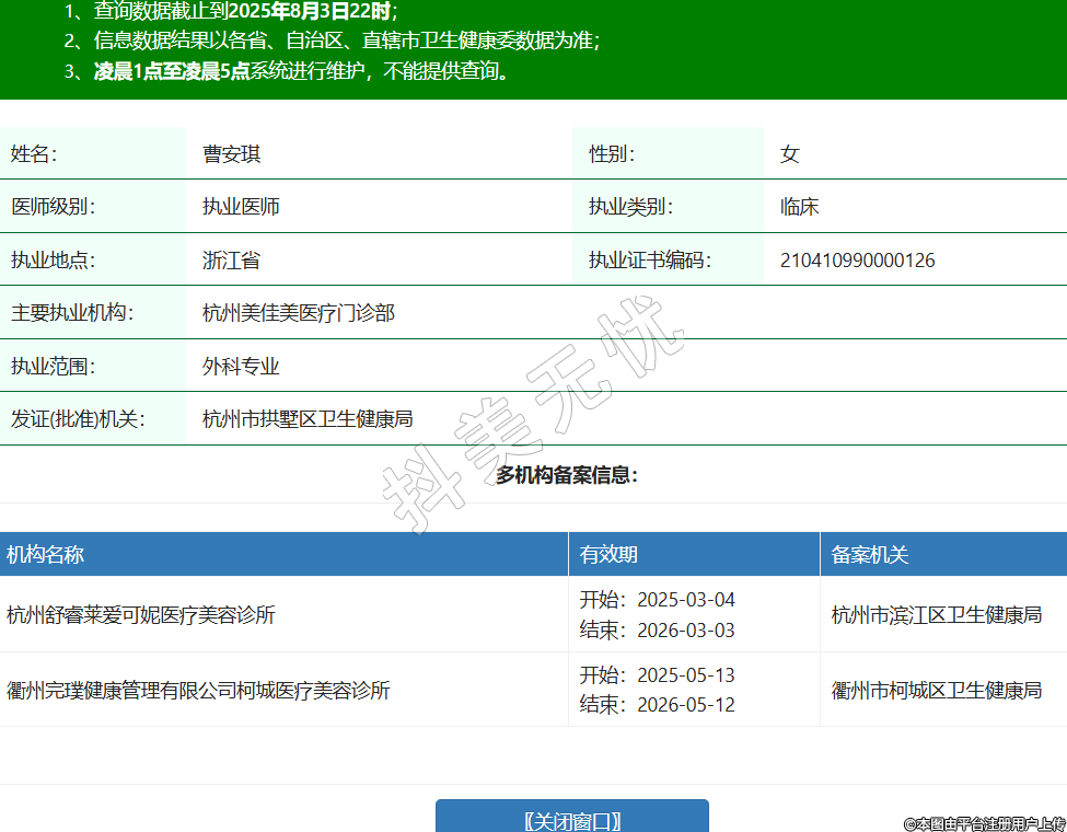 姓名:曹安琪性別:女醫(yī)師級(jí)別:執(zhí)業(yè)醫(yī)師執(zhí)業(yè)類別:臨床執(zhí)業(yè)地點(diǎn):浙江省執(zhí)業(yè)證書編碼:210410990000126主要執(zhí)業(yè)機(jī)構(gòu):杭州美佳美醫(yī)療門診部執(zhí)業(yè)范圍:外科專業(yè)發(fā)證(批準(zhǔn))機(jī)關(guān):杭州市拱墅區(qū)衛(wèi)生健康局多機(jī)構(gòu)備案信息:機(jī)構(gòu)名稱 有效期 備案機(jī)關(guān) 杭州舒睿萊愛可妮醫(yī)療美容診所 開始:2025-03-04結(jié)束:2026-03-03杭州市濱江區(qū)衛(wèi)生健康局 衢州完璞健康管理有限公司柯城醫(yī)療美容診所 開始:2025-05-13結(jié)束:2026-05-12衢州市柯城區(qū)衛(wèi)生健康局 -