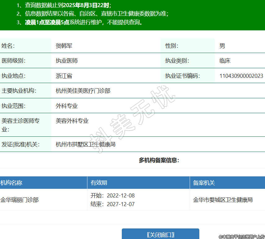 姓名:賀韓軍性別:男醫(yī)師級別:執(zhí)業(yè)醫(yī)師執(zhí)業(yè)類別:臨床執(zhí)業(yè)地點(diǎn):浙江省執(zhí)業(yè)證書編碼:110430900002023主要執(zhí)業(yè)機(jī)構(gòu):杭州美佳美醫(yī)療門診部執(zhí)業(yè)范圍:外科專業(yè)美容主診醫(yī)師專業(yè):美容外科專業(yè)發(fā)證(批準(zhǔn))機(jī)關(guān):杭州市拱墅區(qū)衛(wèi)生健康局多機(jī)構(gòu)備案信息:機(jī)構(gòu)名稱 有效期 備案機(jī)關(guān) 金華瑞麗門診部 開始:2022-12-08結(jié)束:2027-12-07金華市婺城區(qū)衛(wèi)生健康局 -