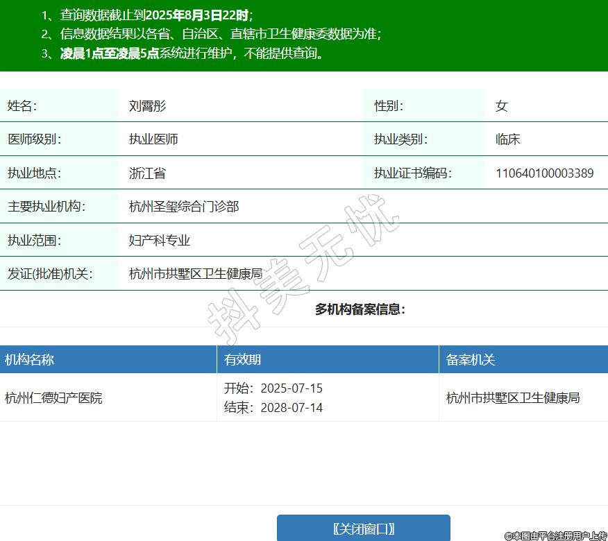姓名:劉霄彤性別:女醫(yī)師級別:執(zhí)業(yè)醫(yī)師執(zhí)業(yè)類別:臨床執(zhí)業(yè)地點:浙江省執(zhí)業(yè)證書編碼:110640100003389主要執(zhí)業(yè)機構(gòu):杭州圣璽綜合門診部執(zhí)業(yè)范圍:婦產(chǎn)科專業(yè)發(fā)證(批準)機關(guān):杭州市拱墅區(qū)衛(wèi)生健康局多機構(gòu)備案信息:機構(gòu)名稱 有效期 備案機關(guān) 杭州仁德婦產(chǎn)醫(yī)院 開始:2025-07-15結(jié)束:2028-07-14杭州市拱墅區(qū)衛(wèi)生健康局 -