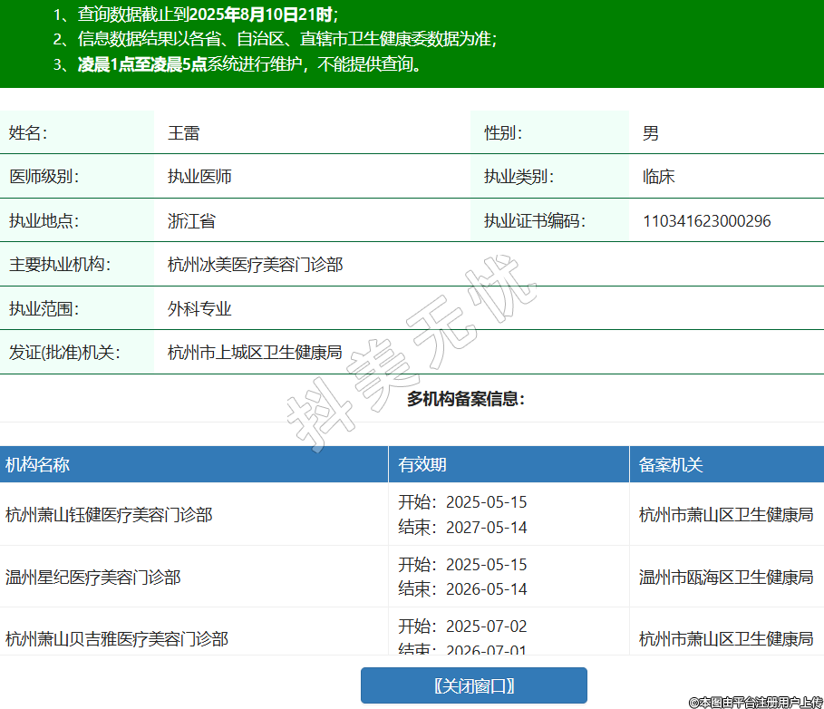 姓名:王雷性別:男醫(yī)師級別:執(zhí)業(yè)醫(yī)師執(zhí)業(yè)類別:臨床執(zhí)業(yè)地點:浙江省執(zhí)業(yè)證書編碼:110341623000296主要執(zhí)業(yè)機構:杭州冰美醫(yī)療美容門診部執(zhí)業(yè)范圍:外科專業(yè)發(fā)證(批準)機關:杭州市上城區(qū)衛(wèi)生健康局多機構備案信息:機構名稱 有效期 備案機關 杭州蕭山鈺健醫(yī)療美容門診部 開始:2025-05-15結束:2027-05-14杭州市蕭山區(qū)衛(wèi)生健康局 溫州星紀醫(yī)療美容門診部 開始:2025-05-15結束:2026-05-14溫州市甌海區(qū)衛(wèi)生健康局 杭州蕭山貝吉雅醫(yī)療美容門診部 開始:2025-07-02結束:2026-07-01杭州市蕭山區(qū)衛(wèi)生健康局 -