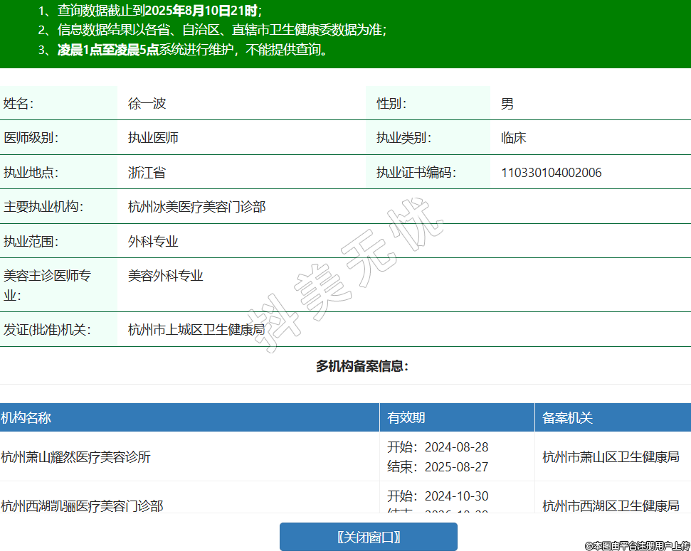 姓名:徐一波性別:男醫(yī)師級別:執(zhí)業(yè)醫(yī)師執(zhí)業(yè)類別:臨床執(zhí)業(yè)地點:浙江省執(zhí)業(yè)證書編碼:110330104002006主要執(zhí)業(yè)機構(gòu):杭州冰美醫(yī)療美容門診部執(zhí)業(yè)范圍:外科專業(yè)美容主診醫(yī)師專業(yè):美容外科專業(yè)發(fā)證(批準(zhǔn))機關(guān):杭州市上城區(qū)衛(wèi)生健康局多機構(gòu)備案信息:機構(gòu)名稱 有效期 備案機關(guān) 杭州蕭山耀然醫(yī)療美容診所 開始:2024-08-28結(jié)束:2025-08-27杭州市蕭山區(qū)衛(wèi)生健康局 杭州西湖凱驪醫(yī)療美容門診部 開始:2024-10-30結(jié)束:2026-10-29杭州市西湖區(qū)衛(wèi)生健康局 杭州麗脂醫(yī)療科技有限公司和興路醫(yī)療美容門診部 開始:2024-12-17結(jié)束:2025-12-16杭州市上城區(qū)衛(wèi)生健康局 杭州蕭山蘭澤歐醫(yī)療美容門診部 開始:2025-04-16結(jié)束:2026-04-15杭州市蕭山區(qū)衛(wèi)生健康局 杭州至優(yōu)美醫(yī)療美容診所 開始:2025-06-18結(jié)束:2026-06-17杭州市上城區(qū)衛(wèi)生健康局 紹興柯橋璣理醫(yī)療美容門診部 開始:2025-06-23結(jié)束:2026-06-22紹興市柯橋區(qū)衛(wèi)生健康局 杭州凱齡醫(yī)療美容門診部 開始:2025-08-04結(jié)束:2029-08-03杭州市西湖區(qū)衛(wèi)生健康局 -