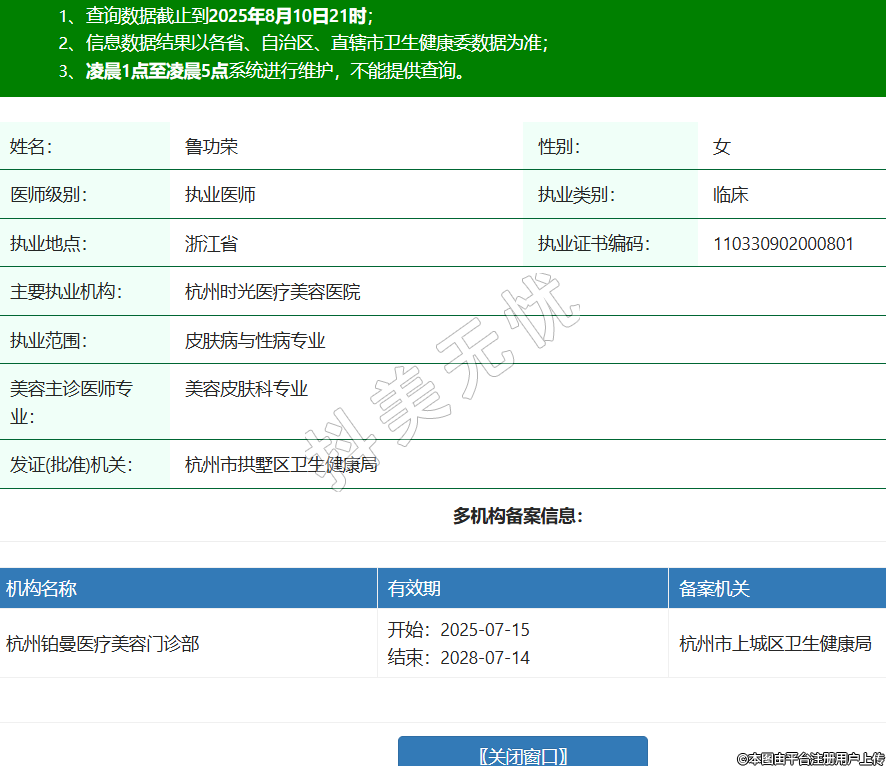 姓名:魯功榮性別:女醫(yī)師級別:執(zhí)業(yè)醫(yī)師執(zhí)業(yè)類別:臨床執(zhí)業(yè)地點:浙江省執(zhí)業(yè)證書編碼:110330902000801主要執(zhí)業(yè)機構:杭州時光醫(yī)療美容醫(yī)院執(zhí)業(yè)范圍:皮膚病與性病專業(yè)美容主診醫(yī)師專業(yè):美容皮膚科專業(yè)發(fā)證(批準)機關:杭州市拱墅區(qū)衛(wèi)生健康局多機構備案信息:機構名稱 有效期 備案機關 杭州鉑曼醫(yī)療美容門診部 開始:2025-07-15結束:2028-07-14杭州市上城區(qū)衛(wèi)生健康局 -