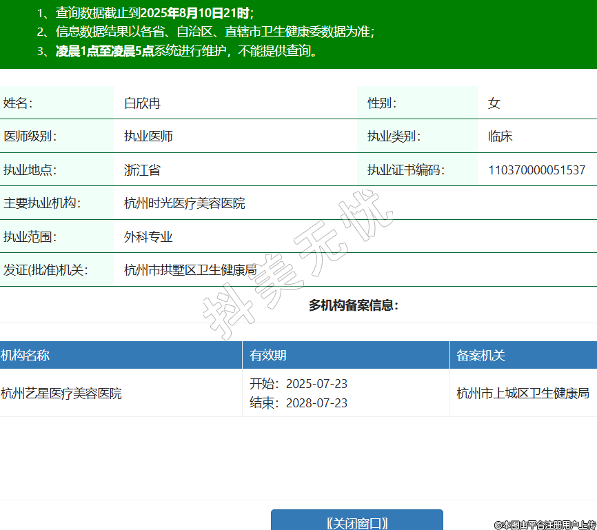 姓名:白欣冉性別:女醫(yī)師級別:執(zhí)業(yè)醫(yī)師執(zhí)業(yè)類別:臨床執(zhí)業(yè)地點:浙江省執(zhí)業(yè)證書編碼:110370000051537主要執(zhí)業(yè)機構(gòu):杭州時光醫(yī)療美容醫(yī)院執(zhí)業(yè)范圍:外科專業(yè)發(fā)證(批準)機關(guān):杭州市拱墅區(qū)衛(wèi)生健康局多機構(gòu)備案信息:機構(gòu)名稱 有效期 備案機關(guān) 杭州藝星醫(yī)療美容醫(yī)院 開始:2025-07-23結(jié)束:2028-07-23杭州市上城區(qū)衛(wèi)生健康局 -
