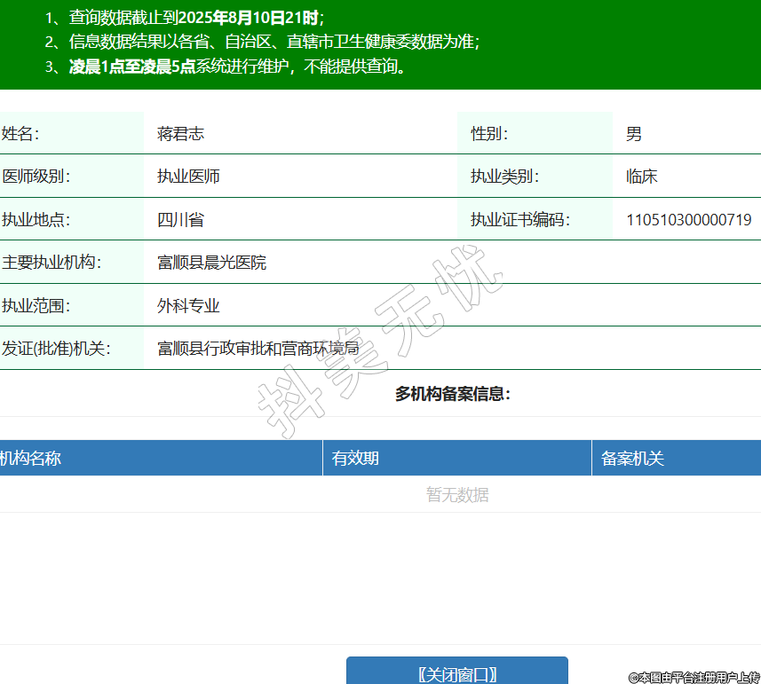 姓名:蔣君志性別:男醫(yī)師級別:執(zhí)業(yè)醫(yī)師執(zhí)業(yè)類別:臨床執(zhí)業(yè)地點:四川省執(zhí)業(yè)證書編碼:110510300000719主要執(zhí)業(yè)機(jī)構(gòu):富順縣晨光醫(yī)院執(zhí)業(yè)范圍:外科專業(yè)發(fā)證(批準(zhǔn))機(jī)關(guān):富順縣行政審批和營商環(huán)境局 -